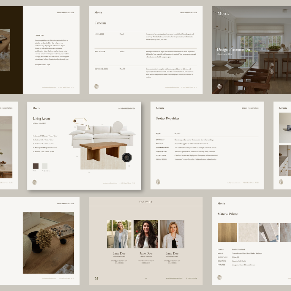 The Morris Design Presentation is designed to coordinate with The Morris Website Template. The Morris collection offers an elevated, visually captivating design that showcases your work with a straightforward sophistication.