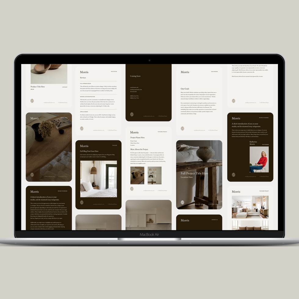 Each pin design was crafted with designers in mind. We designed each one to be edited in the Canva app, so you won’t need a graphic designer or access to expensive programs. With 20 designs to choose from, these templates empower designers to keep their Pinterest content cohesive and on-brand but never stale. This thoughtful curation of Pinterest pin designs is a seamless extension of the complete Morris experience, including The Morris Website Template and comprehensive Client Process Bundle. Combine them for a refined client experience or mix-and-match with our other on-trend templates for interior designers.