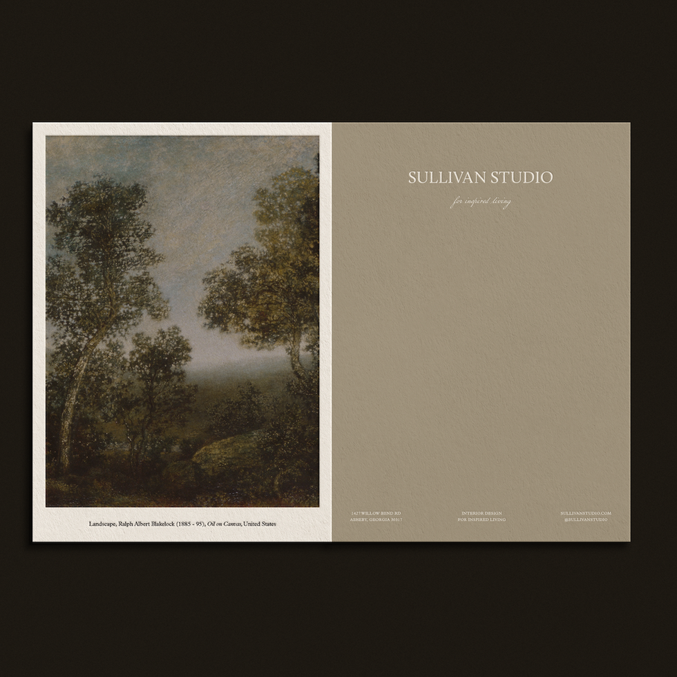 The Sullivan semi-custom branding suite was created with storied, layered interiors in mind. A distinctive – yet timeless – serif typeset is paired with a handdrawn-style script to create warmth and interest. Reminiscent of a monogram, the icon will be customized to your brand initials but with a vintage style that mimics a potter’s mark or book publishing stamp. This suite is a juxtaposition between masculine and feminine elements, with a classic ticking stripe balanced by the delicate script. From the logo to the typeface to the pattern and color palette, each piece will distinguish you as a tastemaker, and is designed to seamlessly embody your brand identity across both print and digital platforms.